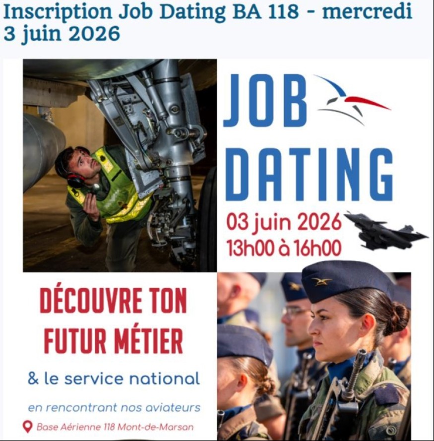 La BA 118 de Mont-de-Marsan organise un job dating à destination des 14 / 30 ans, ce mercredi 3 juin, de 13 à 16h…